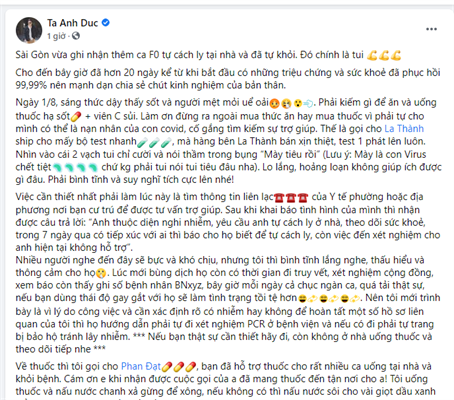 Chia sẻ của Anh Đức ngay sau đó được nhiều khán giả, người thân và giới nghệ sĩ vô cùng ngạc nhiên và gửi lời chúc mừng đến nam diễn viên đã vượt qua dịch bệnh. “Sài Gòn vừa ghi nhận thêm ca F0 tự cách ly tại nhà và đã tự khỏi. Đó chính là tui”, Anh Đức thông báo. Nam diễn viên cho biết, cho đến bây giờ đã hơn 20 ngày kể từ khi bắt đầu có những triệu chứng và sức khoẻ đã phục hồi 99,99% nên mạnh dạn chia sẻ chút kinh nghiệm của bản thân.