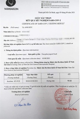 Giấy xác nhận kết quả xét nghiệm dương tính với virus Sars-CoV-2 ngày 3.8 của nam diễn viên
