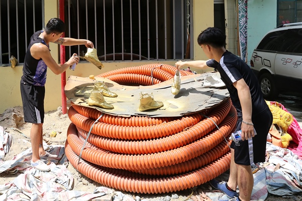 Tận dụng khoảng nắng trong khuôn viên rạp xiếc, 2 diễn viên đang sơn mầu trang trí giày