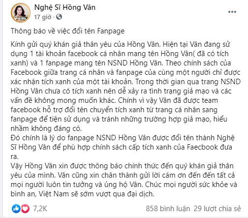 Trong loạt bê bối về việc PR trá hình thực phẩm chức năng, phát ngôn không đúng về đại dịch thời gian qua, cái tên Hồng Vân đã được nhắc đến khá nhiều. Mặc dù đã lên tiếng phân trần, xin lỗi khán giả, nhưng hình ảnh của nữ nghệ sĩ vẫn bị ảnh hưởng nhiều trong mắt công chúng. Vì vậy, việc fanpage đổi tên từ “NSND Hồng Vân” thành “Nghệ sĩ Hồng Vân” đã một lần này làm dậy sóng dư luận.