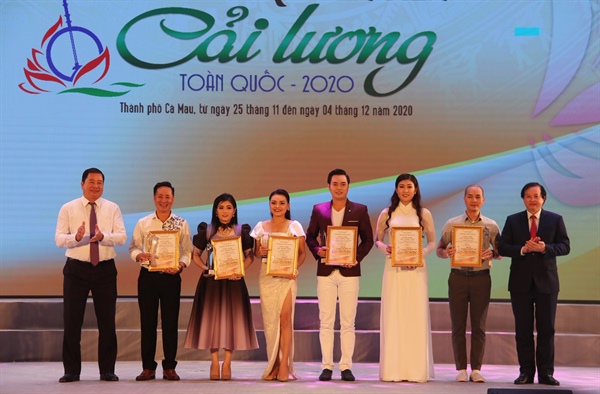 Phó Cục trưởng Cục Nghệ thuật biểu diễn, Trưởng BTC Cuộc thi Trần Hướng Dương và Tỉnh ủy viên, Giám đốc Sở VHTTDL tỉnh Cà Mau, đồng Trưởng BTC Trần Hiếu Hùng trao giải Huy chương Bạc cho các diễn viên