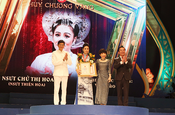 Giám đốc Sở VHTT TP.HCM Trần Thế Thuận (ngoài cùng, bên phải) và vợ chồng NSƯT Thanh Điền - Thanh Kim Huệ trao HCV cho NSƯT Thiên Hoa
