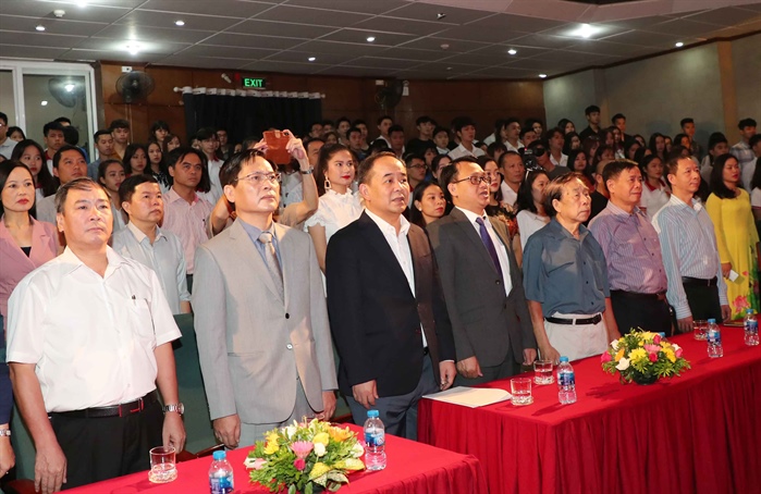 Thứ trưởng Lê Khánh Hải cùng thầy trò Trường Đại học Sân khấu - Điện ảnh Hà Nội thực hiện nghi lễ chào cờ trong lễ Khai giảng năm học 2018-2019