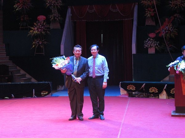 Thứ trưởng Tạ Quang Đông tặng hoa chúc mừng TS.NSND Hoàng Minh Khánh, nguyên Hiệu trưởng của trường