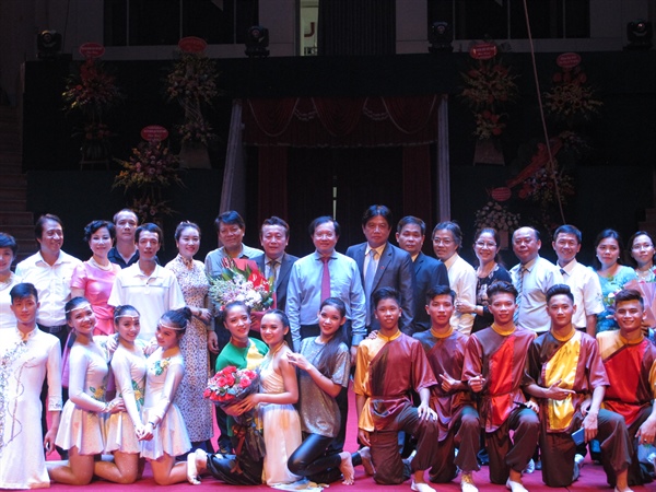 Thứ trưởng Tạ Quang Đông chụp ảnh lưu niệm với thầy và trò Trường Trung cấp nghệ thuật Xiếc và Tạp kỹ VN tại lễ khai giảng năm học mới