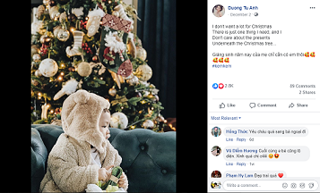 Trong bài đăng cận mặt con trai cưng, Tú Anh chia sẻ: “Tôi không mong ước nhiều thứ vào lễ Giáng sinh cũng không bận tâm về những món quà. Thứ tôi cần ngay lúc này đang ở dưới cây thông Noel... Giáng sinh năm nay, mẹ chỉ cần có con". Những chia sẻ tuy ngắn gọn nhưng tràn đầy tình yêu thương của Tú Anh về bé Kem khiến cộng đồng các mẹ bỉm sữa vô cùng ngưỡng mộ.