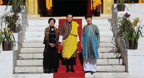 Đại sứ Phạm Sanh Châu và phu nhân chụp ảnh cùng Nhà vua Bu-Tan sau lễ trình Quốc thư. Ảnh: Hoàng gia Bu Tan
