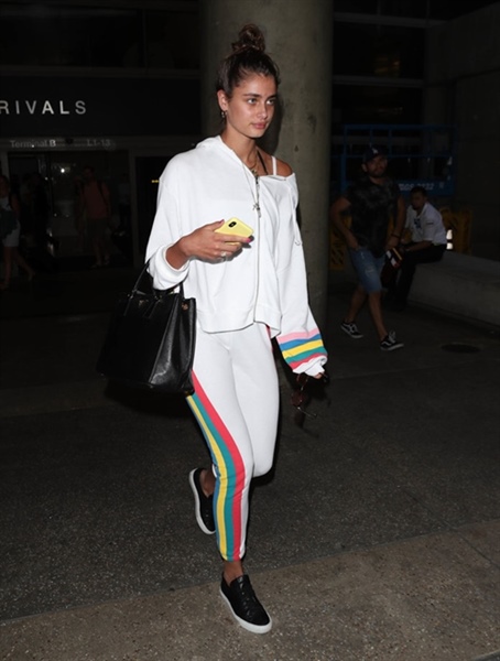 Muốn mặc cả bộ thể thao mà vẫn nổi bật và gợi cảm như thiên thần Taylor Hill, bạn chỉ cần kéo lệch một bên vai áo là đủ.