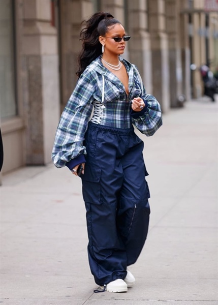 Không chọn kiểu quần bo gấu như nhiều mỹ nhân khác, Rihanna chịu chơi khi mặc chiếc quần thể thao rộng thùng thình với sơ mi cách điệu.
