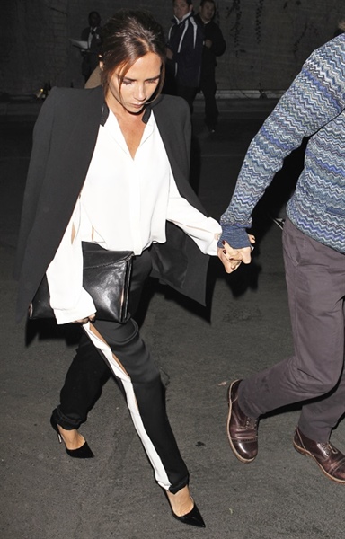 Một lần khác, bà Becks dễ dàng chinh phục chiếc quần thể thao tối giản chỉ bằng cách mix cùng giày cao gót, sơ mi và blazer thanh lịch.