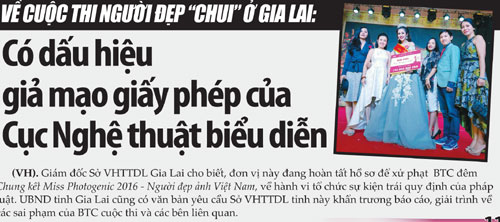 Đến ngày 26.12.2016, Công ty 24G đã tự ý công khai treo băng rôn, quảng cáo với nội dung: Đêm khoe sắc của người đẹp (có ca sĩ Đàm Vĩnh Hưng biểu diễn) về tham dự đêm trao giải tôn vinh phái đẹp. Ngay trong ngày, Thanh tra Sở VHTTDL Gia Lai đã lập biên bản vụ việc, yêu cầu đơn vị tổ chức tháo dỡ băng rôn và không được tổ chức chương trình này. Tuy nhiên, đến ngày 28.12.2016, khi Công an tỉnh Gia Lai và các đơn vị chức năng kiểm tra khách sạn Pleiku Place thì tiếp tục phát hiện Cty 24G dựng các phông quảng cáo với nội dung: Chung kết Miss Photogenic 2016, lễ trao giải Miss Photogenic 2016. Trong đêm này, Ban tổ chức đã đăng tải thông tin trên trang nguoidepvn.vn là cuộc thi “thành công tốt đẹp” và đã chọn ra được Hoa khôi, Á khôi và trao thưởng.