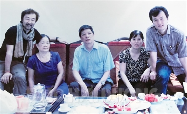Hai người Nhật Bản trong ê kíp của Hãng sản xuất chương trình truyền hình NDN thực hiện bộ phim "Đi tìm người lính trẻ năm ấy" chụp ảnh cùng gia đình cựu chiến binh Vũ Bình Minh năm 2015