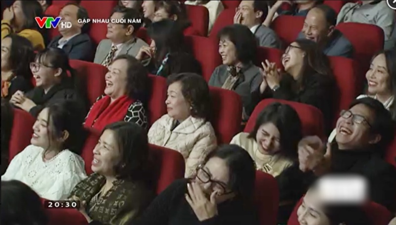 Hình ảnh khán giả ngồi sát nhau, không đeo khẩu trang trên sóng Táo Quân 2022. Ảnh chụp màn hình