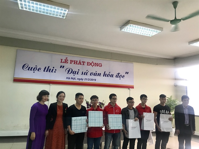 Lãnh đạo Vụ Thư viện, Đại học Bách khoa Hà Nội và Thư viện Tạ Quang Bửu tặng quà cho các sinh viên tích cực tới thư viện học tập, nghiên cứu
