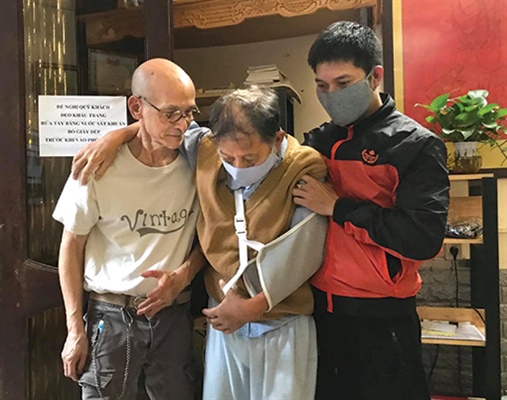 Nhà văn Nguyễn Văn Thọ dìu nhà văn Nguyễn Huy Thiệp từ nhà lương y trở về. Ảnh: danviet.vn