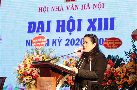 Chủ tịch Hội Nhà văn Hà Nội khóa XII Nguyễn Thị Thu Huệ phát biểu tại Đại hội