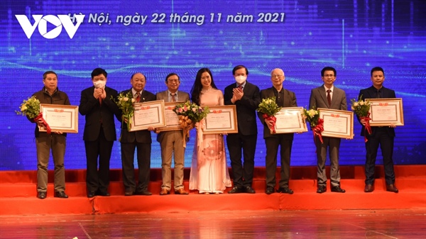 Phó Trưởng ban Thường trực Ban Tuyên giáo Trung ương Lại Xuân Môn và Tổng Giám đốc Đài Tiếng nói Việt Nam Đỗ Tiến Sỹ trao Chứng nhận cho các tác giả đạt mức B