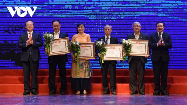 Thứ trưởng Bộ VHTTDL Tạ Quang Đông và nguyên Tổng Giám đốc Đài Tiếng nói Việt Nam Nguyễn Thế Kỷ trao Chứng nhận cho các tác giả đạt mức C