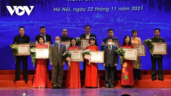 Phó Trưởng ban Thường trực Ban Tuyên giáo Trung ương Lại Xuân Môn và Tổng Giám đốc Đài Tiếng nói Việt Nam Đỗ Tiến Sỹ trao Chứng nhận cho các tác giả đạt mức B