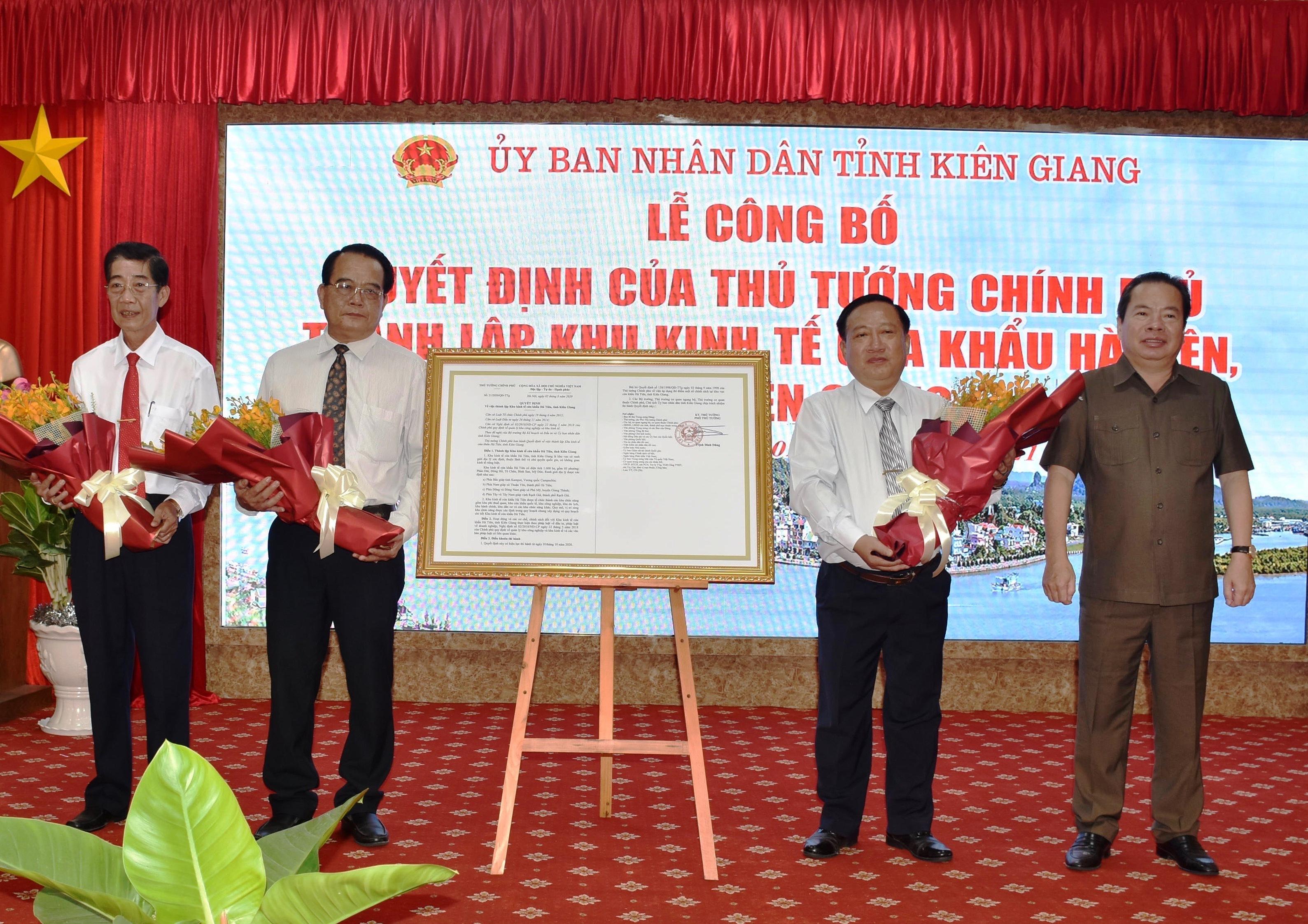 Thừa ủy quyền của Thủ tướng Chính phủ, Phó Bí thư Thường trực Tỉnh ủy Kiên Giang Mai Văn Huỳnh (bìa phải) trao Quyết định thành lập khu kinh tế cửa khẩu Hà Tiên cho các đồng chí lãnh đạo Ban Quản lý khu kinh tế