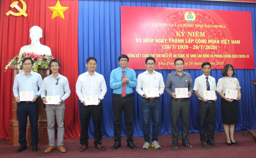 Đại diện LĐLĐ tỉnh Khánh Hòa trao bằng Lao động sáng tạo cho những cá nhân có nhiều sáng kiến hữu ích