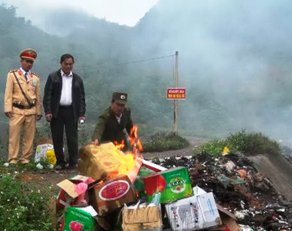 Lực lượng chức năng tiêu hủy hàng kém chất lượng tại huyện Kỳ Sơn, Nghệ An