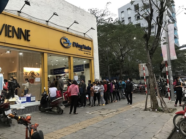Một điểm bán hàng của Dệt Kim Đông Xuân đông kín người đứng xếp hàng chờ mua khẩu trang