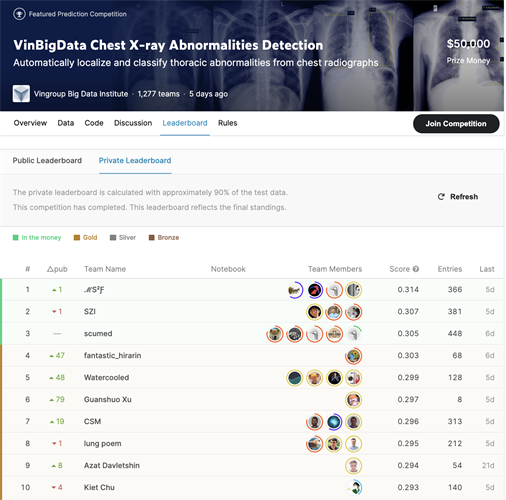 TS. Nguyễn Quý Hà, Trưởng phòng Xử lý ảnh y tế, Viện Nghiên cứu Dữ liệu lớn VinBigdata (Tập đoàn Vingroup) cho biết:“Với bộ dữ liệu chất lượng và quy mô lớn, cuộc thi của chúng tôi đã thu hút hàng nghìn thành viên tham dự, trong đó hơn 10% là Kaggle Master hoặc Grandmaster - các Đại kiện tướng trên Kaggle về Khoa học dữ liệu và các chuyên gia đến từ các công ty công nghệ lớn trên thế giới như Google, NVIDIA, Intel, ABBYY, Oracle, Preferred Networks... Ba đội thi xuất sắc dẫn đầu đã có những cách tiếp cận hiệu quả, từ đó có thể phát triển những giải pháp có ý nghĩa thực tiễn. Đặc biệt với 103 đội thi Việt Nam tham dự, đây là cuộc thi về Khoa học Dữ liệu quy mô toàn cầu có nhiều đội Việt Nam tham gia nhất từ trước đến nay.”
