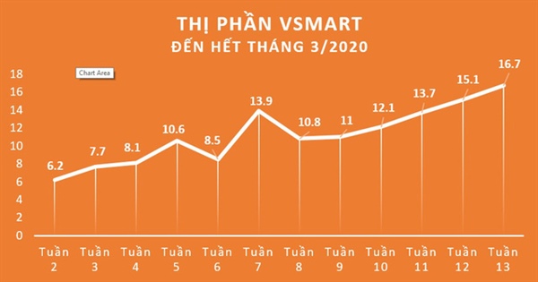 Tuy nhiên, điều bất ngờ đã xảy ra ngay trong quý I/2020 khi điện thoại Vsmart của công ty VinSmart đã qua mặt cả ông lớn Apple và Vivo một cách ngoạn mục để vươn lên vị trí thứ ba với thị phần hai chữ số (16,7% vào tuần cuối tháng 3.2020 theo số liệu từ GfK). Đáng nói hơn, VinSmart đạt được thành tích này chỉ sau 15 tháng thành lập và vẫn được coi là tân binh trên thị trường điện thoại.