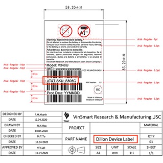 Điểm đáng chú ý là dòng chữ "AT&T SKU: S505C và Dillon Device Label". Như vậy, mẫu điện thoại này do VinSmart phát triển và sản xuất nhưng khi bán ở Mỹ sẽ mang thương hiệu AT&T. Tên máy có thể là Dillon, hoặc nhà mạng có thể đổi tên khi chính thức bán ra thị trường.