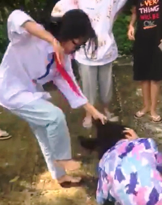 Trong lúc nói chuyện, hai bên có xảy ra xô xát và có một số học sinh đứng xem, quay clip. Đ.L.V. bị học sinh H.Y.M. cùng 5 nữ học sinh khác túm tóc giật ngã, dùng tay, chân đấm, đá vào người. Đáng nói, tại thời điểm xảy ra vụ việc, xung quanh có hàng chục học sinh khác cả nam và nữ nhưng không ai vào can ngăn, thậm chí có nhiều người còn cười đùa, hò hét cổ vũ.