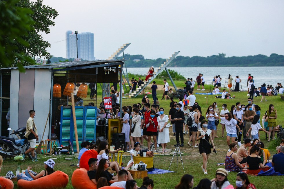 Trước đó, vào chiều 23.5, có khá đông người dân đã tới bãi đá sông Hồng để chụp ảnh, vui chơi, hóng mát. Họ ngồi tập trung ở khu vực có bóng râm và không đảm bảo giãn cách.
