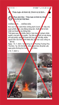 Trước đó, từ chiều 19.7, trên mạng xã hội Facebook xuất hiện và lan truyền hình ảnh một người đàn ông trung niên tự thiêu trên địa bàn phường Trường Thọ, thành phố Thủ Đức, kèm theo bình luận: “Bức xúc vì cách thức chống dịch Covid-19… người dân phẫn uất ngay giữa đường bức bách, tự thiêu.”