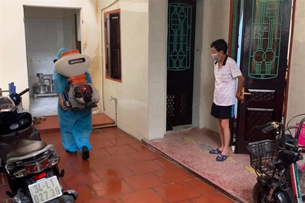Lực lượng chức năng phun khử trùng nhà của người phụ nữ giao bánh cuốn cho người trong khu vực phong toả ở TP.Hải Dương. Ảnh CTV