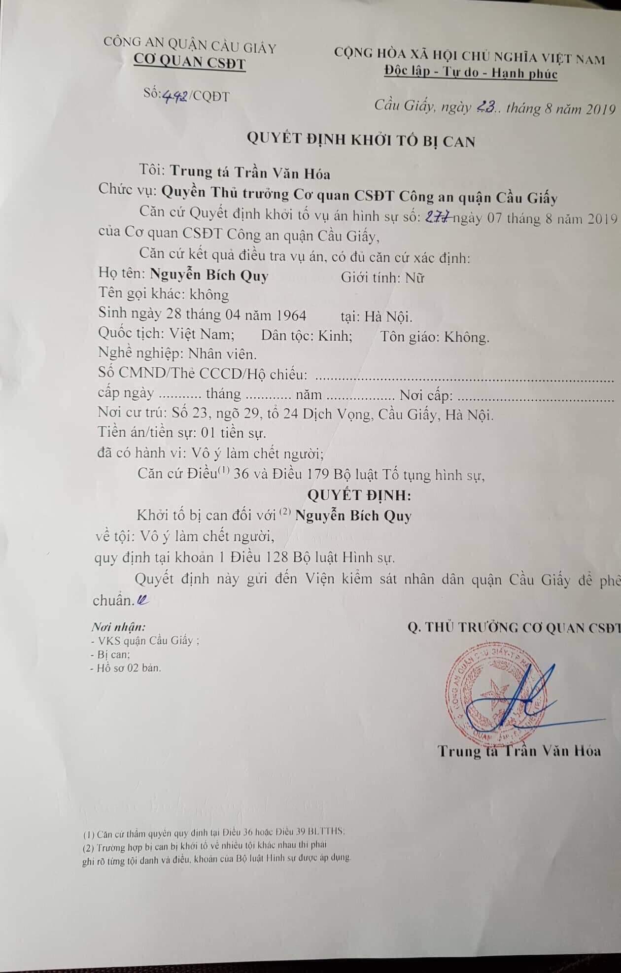 Ngay sau khi vụ án xảy ra, ngày 7.8.2019, cơ quan cảnh sát điều tra Công an quận Cầu Giấy đã ra quyết định khởi tố vụ án “Vô ý làm chết người” theo điều 128 Bộ luật Hình sự và trưng cầu giám định pháp y.