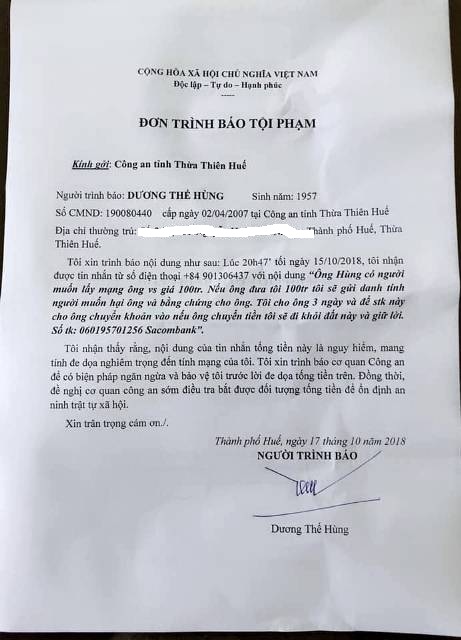 Ngày 17.10, ông Dương Thế Hùng – nguyên Chánh Văn phòng Đoàn ĐBQH tỉnh Thừa Thiên Huế vừa gửi đơn trình báo đến Công an tỉnh về nội dung tin nhắn đe dọa đến điện thoại của ông này.