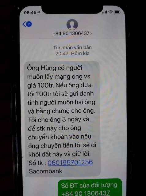 Ông Hùng kể: tối ngày 15.10, tôi đã nhận được một tin nhắn từ số thuê bao không quen. Nội dung tin nhắn là: “Ông Hùng có người muốn lấy mạng ông với giá 100tr. Nếu ông đưa cho tôi 100tr, tôi sẽ gửi danh tính người muốn hại ông và bằng chứng cho ông. Tôi cho ông 3 ngày và để lại stk này cho ông chuyển khoản vào, nếu ông chuyển tiền tôi sẽ đi khỏi đất này và giữ lời. Stk 060195701256 Sacombank”. Tin nhắn được gửi đi từ thuê bao 0901306437.