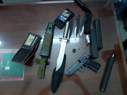Qua kiểm tra xe ô tô này, Đội CSGT số 1 đã phát hiện trên xe ô tô có 2 người gồm: Châu Văn Võ (34 tuổi) và Huỳnh Nguyên (24 tuổi), cùng trú TP Quảng Ngãi, tỉnh Quảng Ngãi và tàng trữ nhiều vũ khí nóng gồm: 1 súng ngắn bắn đạn chì màu bạc và 1 ổ đạn có 8 viên, 1 gậy ba khúc, 1 dao dài 40cm, 3 lưỡi dao dài 20cm;...