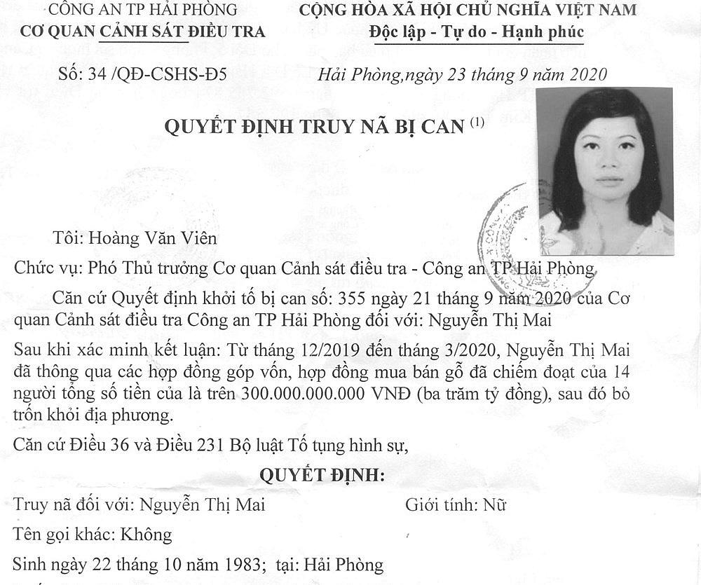 Sau khi xác minh kết luận, từ tháng 12.2019 đến tháng 3.2020, Nguyễn Thị Mai đã thông qua các hợp đồng góp vốn, hợp đồng mua bán gỗ đã chiếm đoạt của 14 người tổng số tiền là trên 300.000.000.000 VND (300 tỉ đồng) sau đó bỏ trốn khỏi địa phương. Tội danh khởi tố: Lạm dụng tín nhiệm chiếm đoạt tài sản quy định tại Điều 175 Bộ luật Hình sự, trốn ngày 31.3.2020.