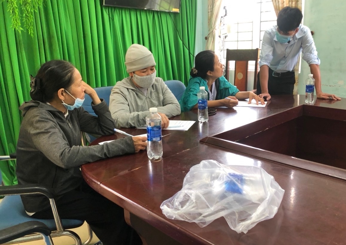 Cơ quan chức năng làm việc và lấy lời khai nhóm 8 người ngoài địa phương đến sinh hoạt tại nhà bà Huê. Ảnh: NL
