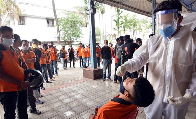 Nhân viên y tế lấy mẫu xét nghiệm Covid-19 cho người dân tại Guwahati, bang Assam (Ấn Độ), ngày 6.6.2021. Ảnh: THX/TTXVN