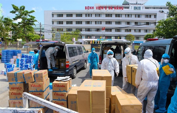 Các nhu yếu phẩm thiết yếu ủng hộ cho đội ngũ y tế và bệnh nhân được bốc dỡ để vận chuyển vào khu vực cách ly ở Bệnh viện C Đà Nẵng