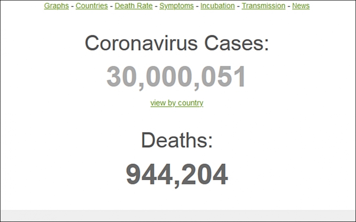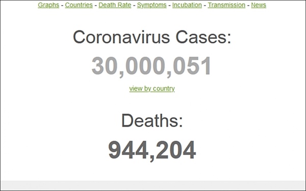Trang thống kê toàn cầu Worldometer cập nhật tình hình Covid-19 ngày 17.9 như sau: Thế giới có 30.000.051 triệu ca nhiễm SARS-CoV-2 (gây bệnh Covid-19) và 944.204 trường hợp tử vong do căn bệnh viêm đường hô hấp cấp này. Số người khỏi bệnh này là 21.767.466.
