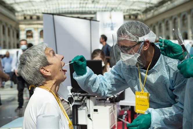 Nhân viên y tế lấy mẫu dịch xét nghiệm Covid-19 cho người dân tại Moskva, Nga, ngày 11.8