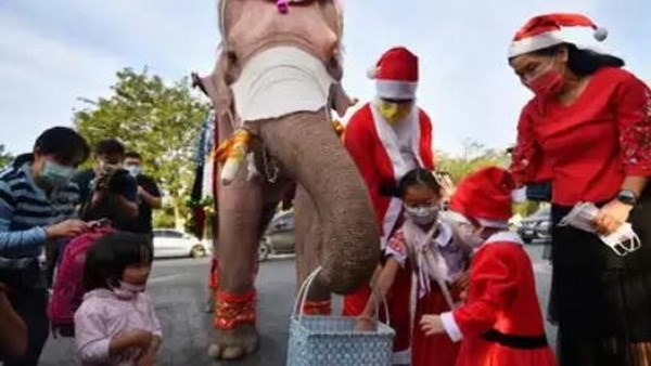 Độc đáo hình ảnh chú voi phát quà Giáng sinh tại Thái Lan