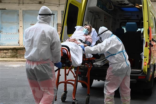 Chuyển bệnh nhân nhiễm Covid-19 tới bệnh viện ở Budapest, Hungary. (Ảnh: AFP/TTXVN)