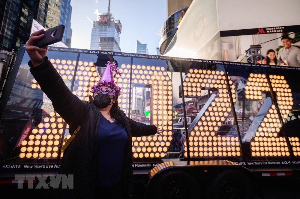 Người dân chụp ảnh chào đón Năm mới trên Quảng trường Thời đại ở New York, Mỹ, ngày 20.12.2021. (Ảnh: AFP/TTXVN)