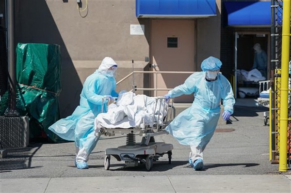 Nhân viên y tế chuyển thi thể bệnh nhân Covid-19 tới nhà xác dã chiến bên ngoài một bệnh viện ở New York, Mỹ