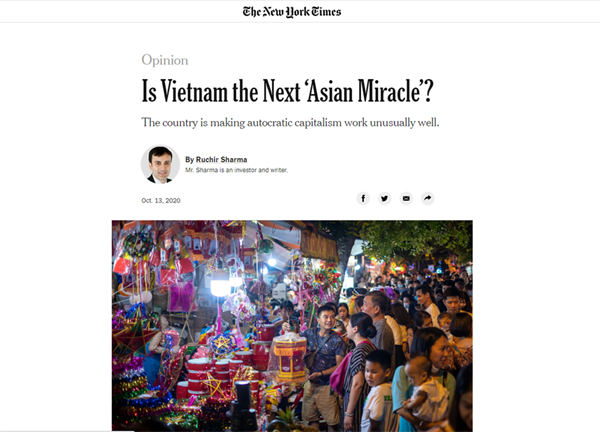 Tờ New York Times ngày 13.10 đăng bài viết: “Is Vietnam the Next Asian Miracle?" - Liệu Việt Nam có phải điều thần kỳ mới của châu Á? - của tác giả Ruchir Sharma, chiến lược gia trưởng toàn cầu của Bộ phận quản lý đầu tư của ngân hàng đầu tư đa quốc gia Morgan Stanley.