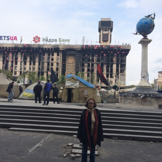 Năm 2014 nơi quảng trường Độc Lập (ở thủ đô Kiev), đám biểu tình đóng lều la liệt. Suốt dọc phố chính, lều, ụ chướng ngại vật bằng lốp xe ô tô, bàn ghế ngổn ngang. Gạch lót đường bị cậy tung khắp nơi để làm vũ khí và để đắp chiến hào như công xã Paris năm 1871. Đoàn người biểu tình mặc quân phục rằn ri sẵn sàng hỗn chiến, nghênh ngang vừa đi vừa hò hét. Các trạm nấu ăn dã chiến phục vụ miễn phí cho người biểu tình lổn nhổn nồi niêu, xoong chảo, và thức ăn dự trữ. Những vết cháy đen loang lổ, cửa kính vỡ nham nhở. Tuy nhiên rải rác một số người vẫn bày hàng bán lưu niệm cùng những hình ảnh mới về cuộc biểu tình. Áp phích dán khắp nơi. Nhà cháy, sự đổ nát nằm nghịch cảnh bên biểu tượng quả địa cầu và chim hòa bình nơi cây số không ở giữa Kiev.